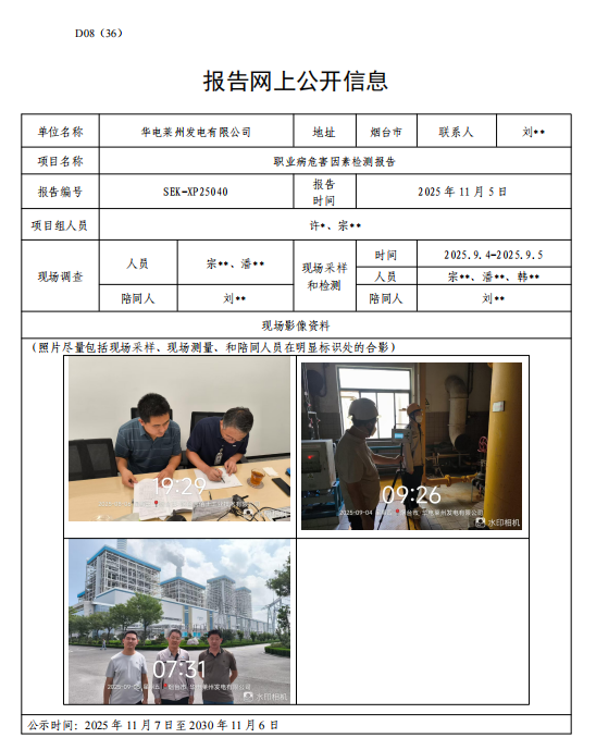 华电莱州发电有限公司职业病危害因素检测报告网上公开信息