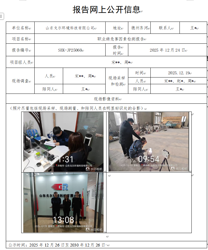 山东戈尔环境科技有限公司职业病危害因素检测报告网上信息公开