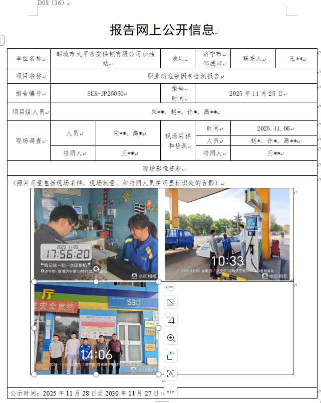 邹城市太平永安供销有限公司加油站职业病危害因素检测报告网上公开信息