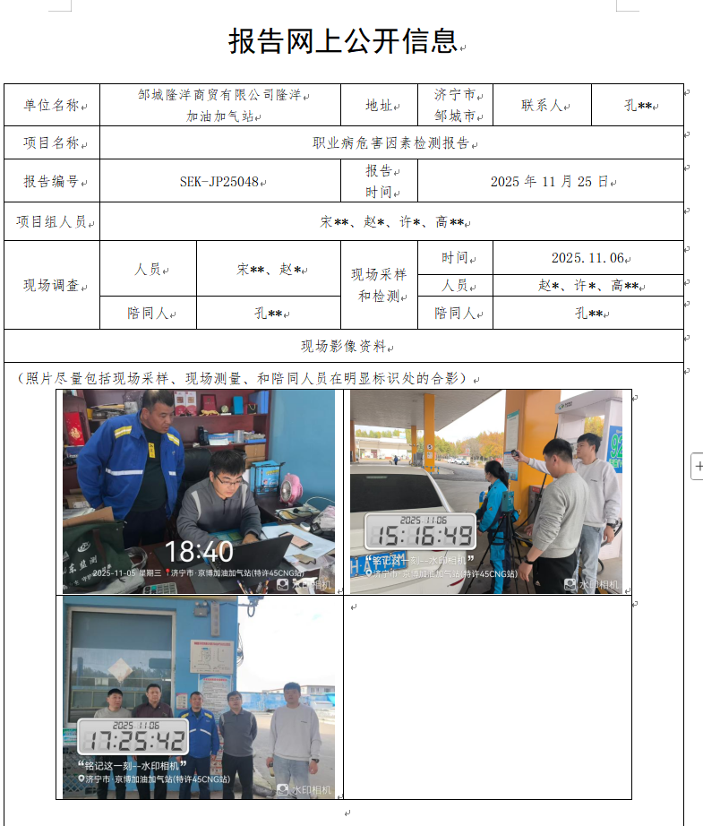 邹城隆洋商贸有限公司隆洋加油加气站职业病危害因素检测报告网上公开信息