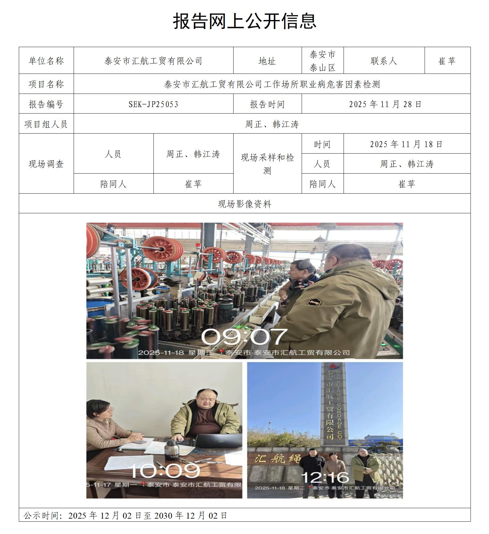泰安市汇航工贸有限公司职业病危害因素检测报告网上公开信息