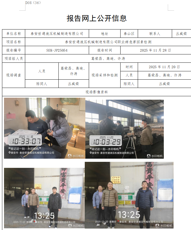 泰安世通液压机械制造有限公司职业病危害因素检测报告网站公示