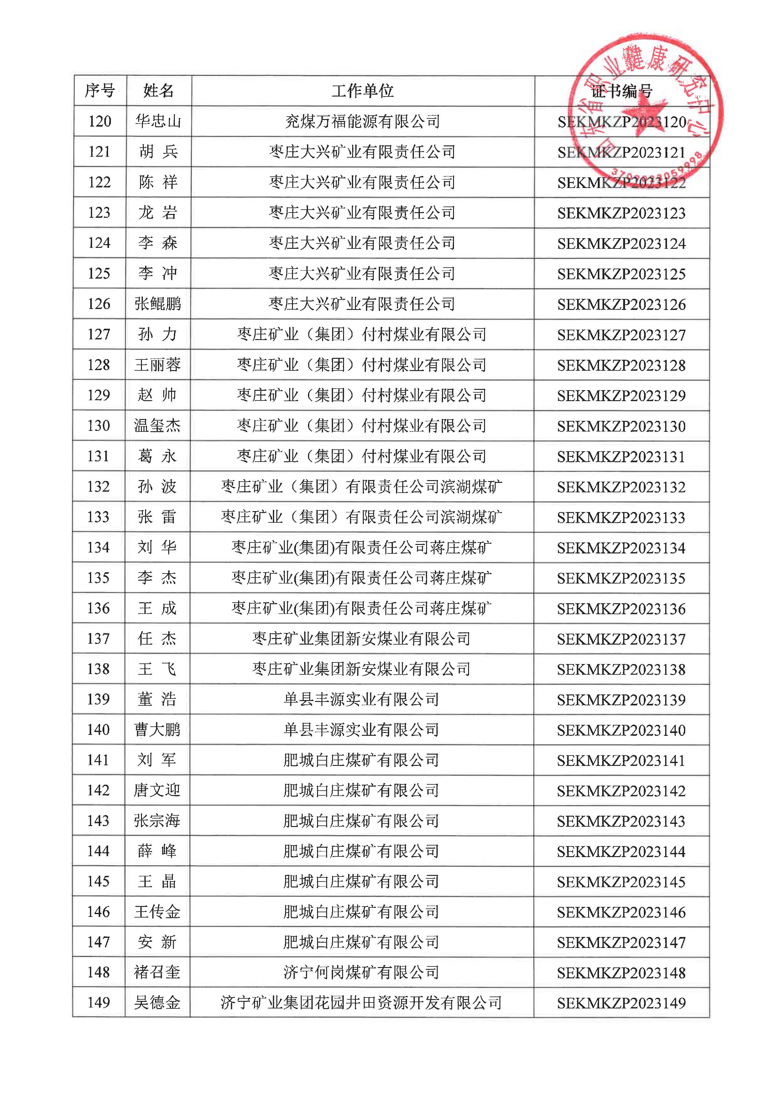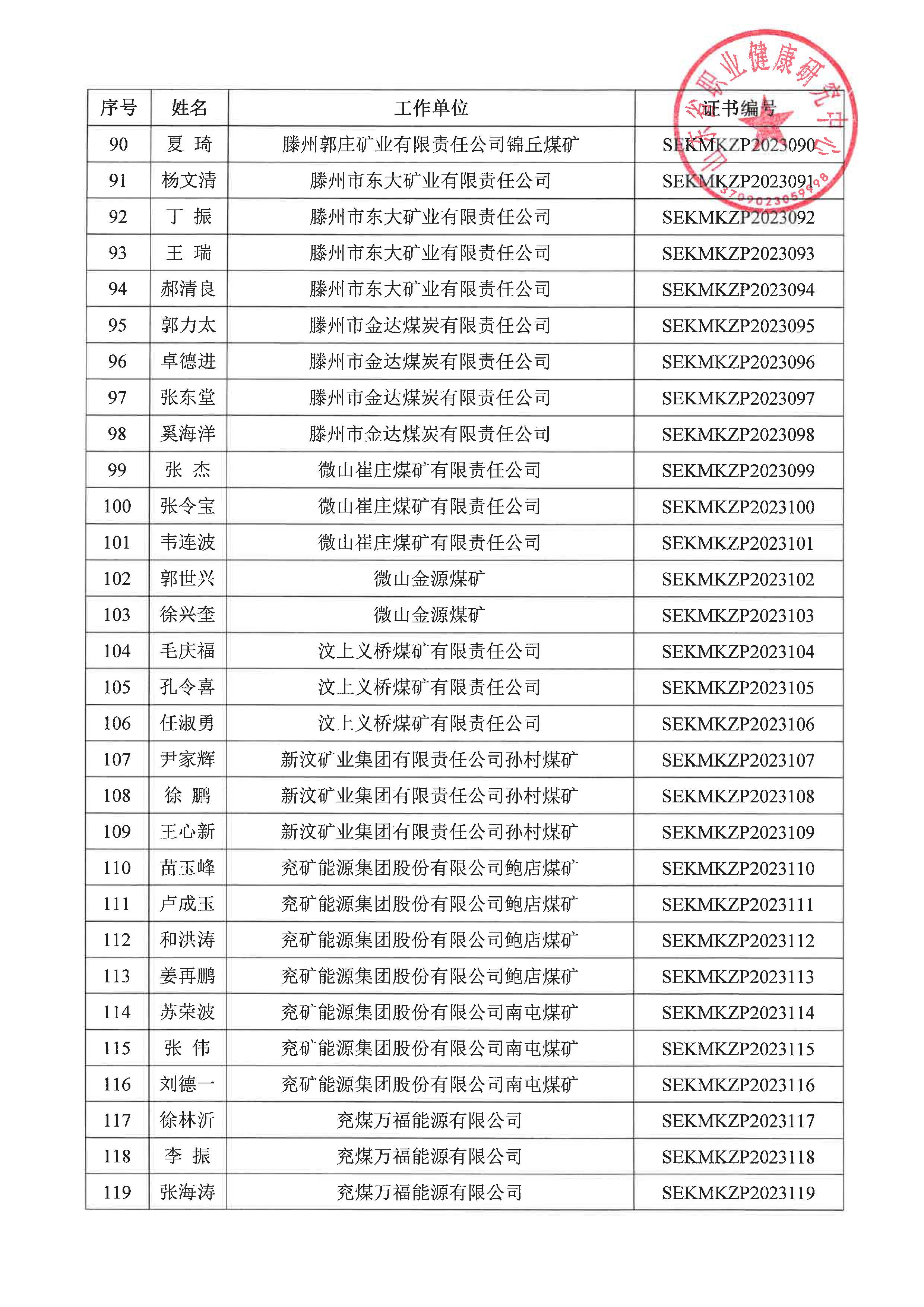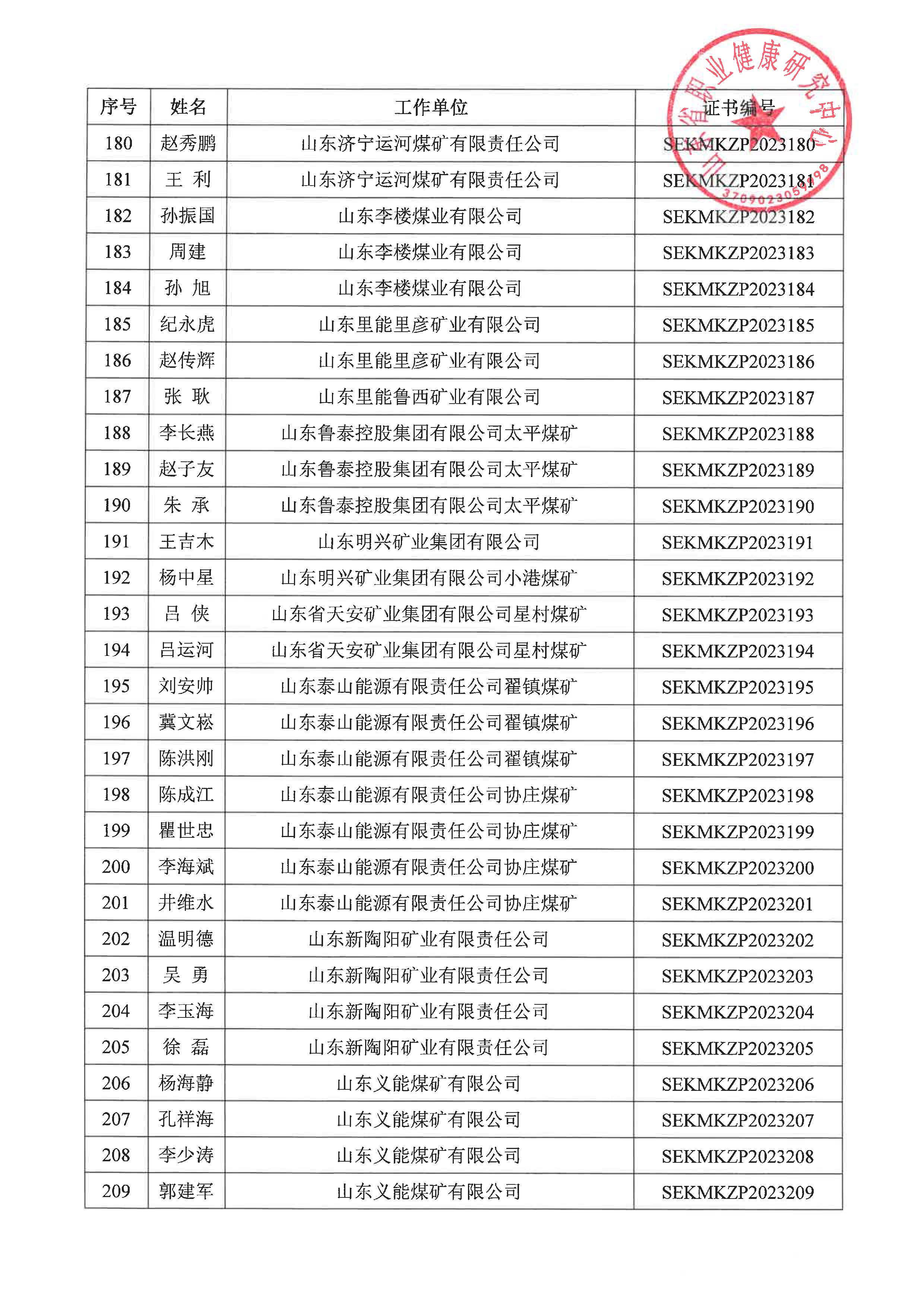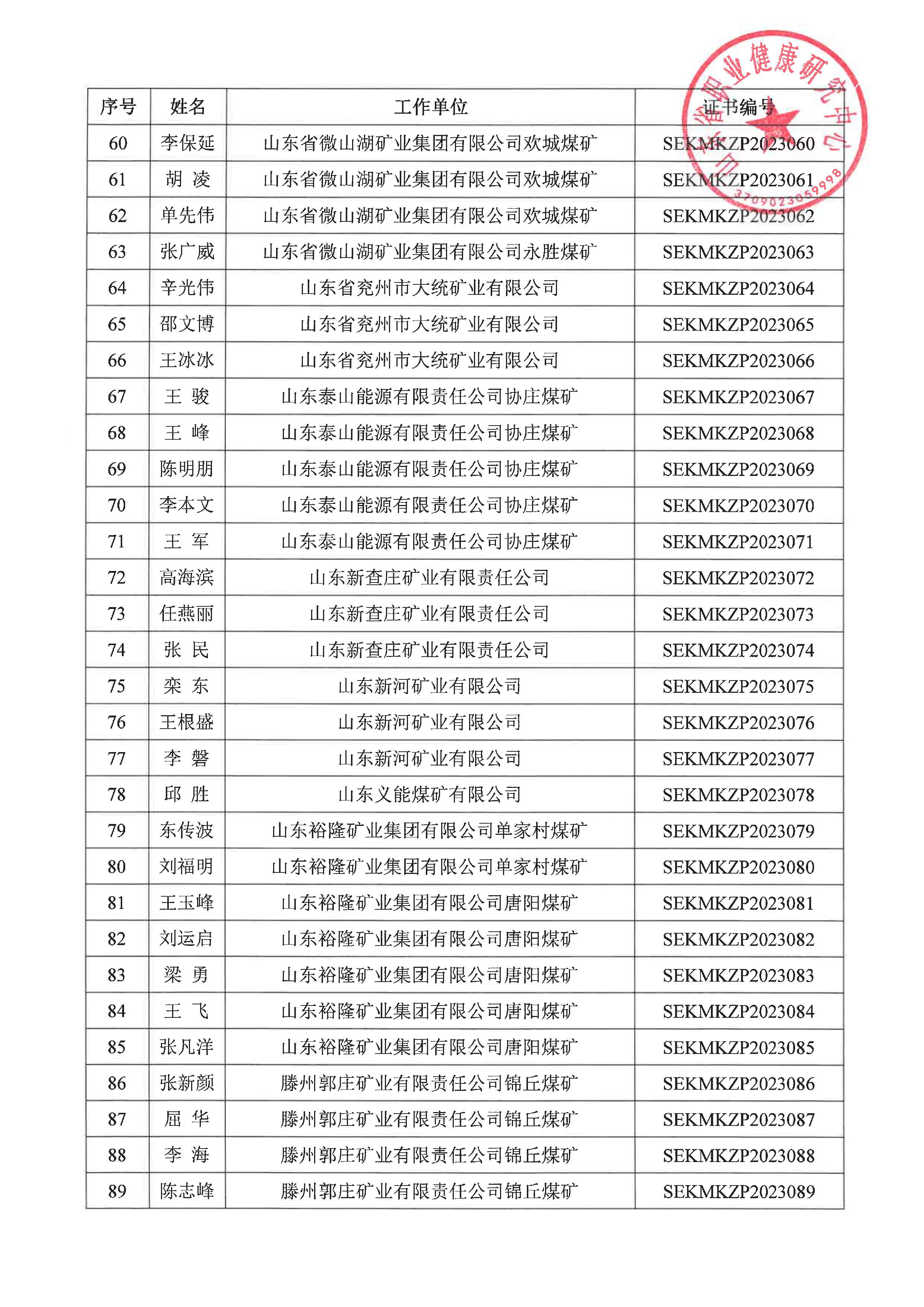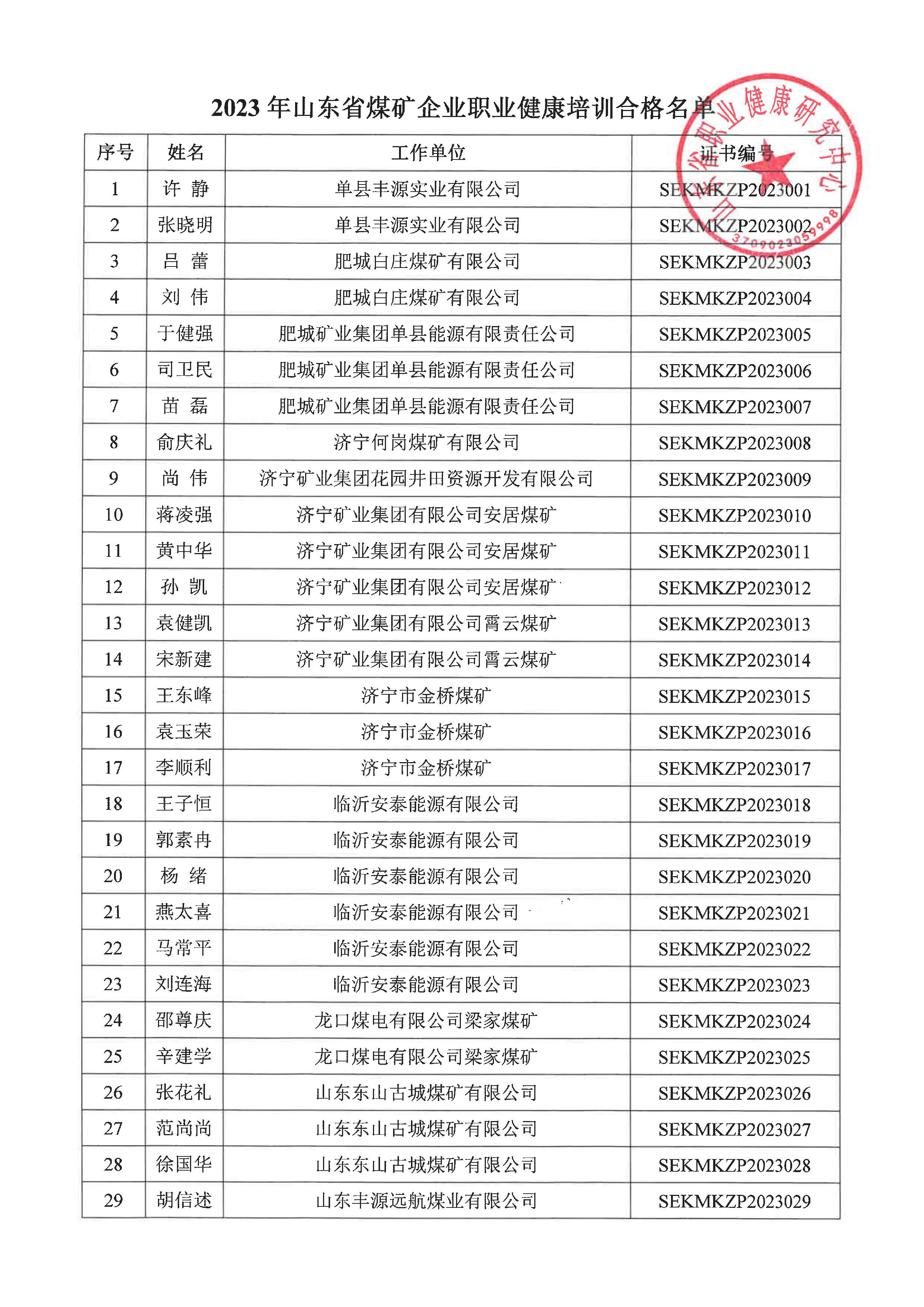 山东省职业健康研究中心于2023年5月举办了两期全省煤矿企业职业健康培训班。(第一期时间为5月8日至5月12日,第二期时间为5月15日至5月19 日),并在培训结束后开展了考核,现将考核合格人员名单予以公示。