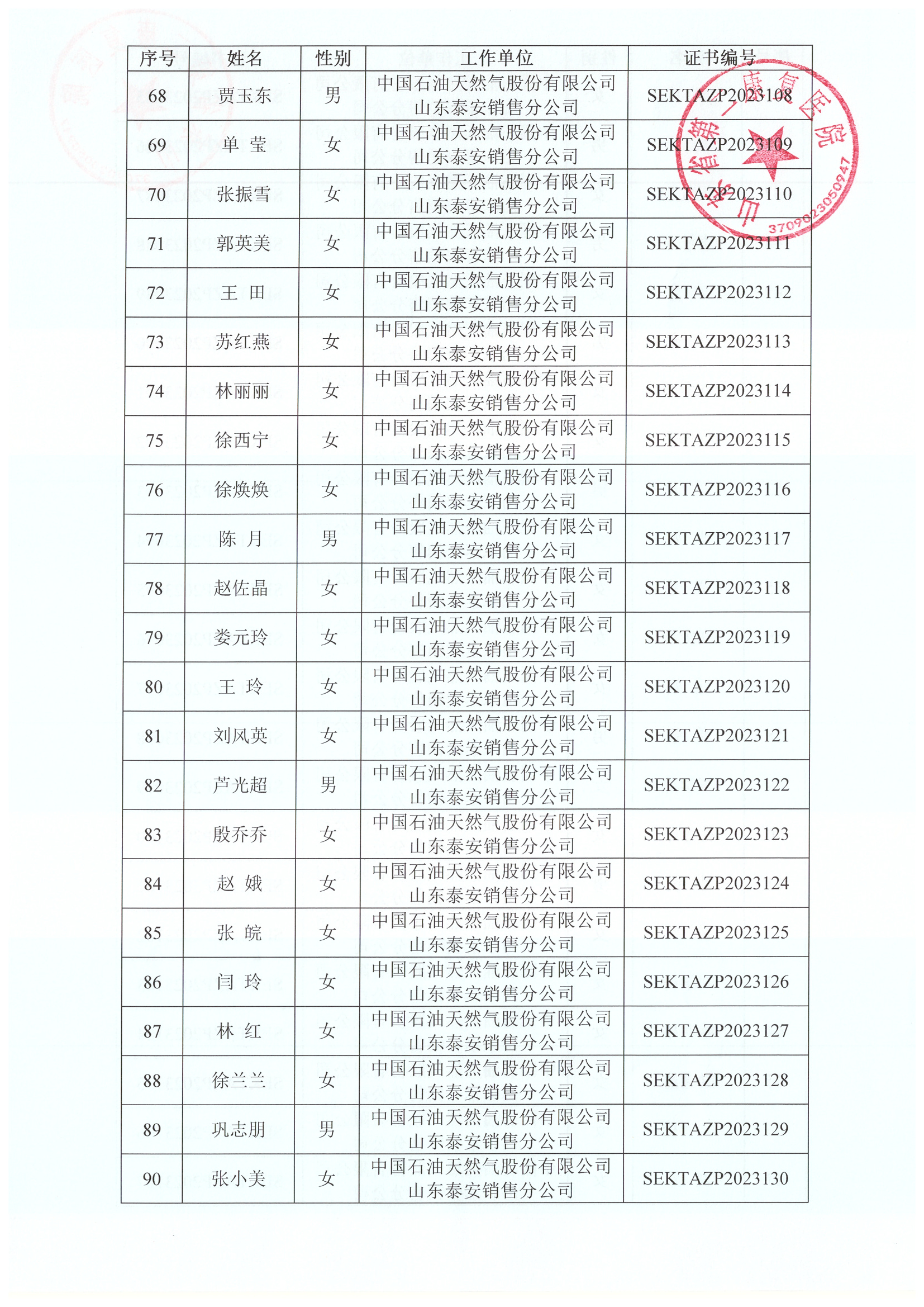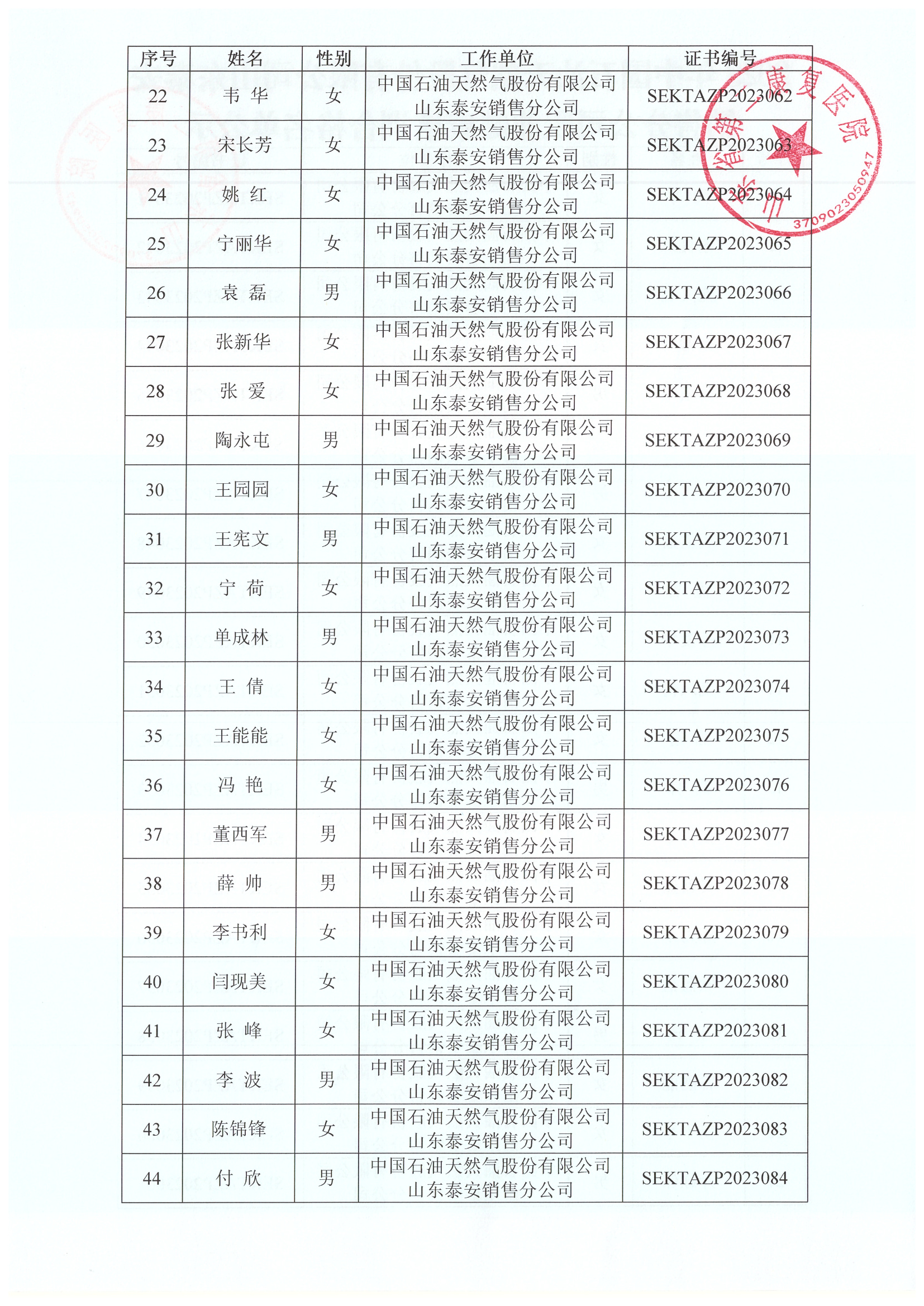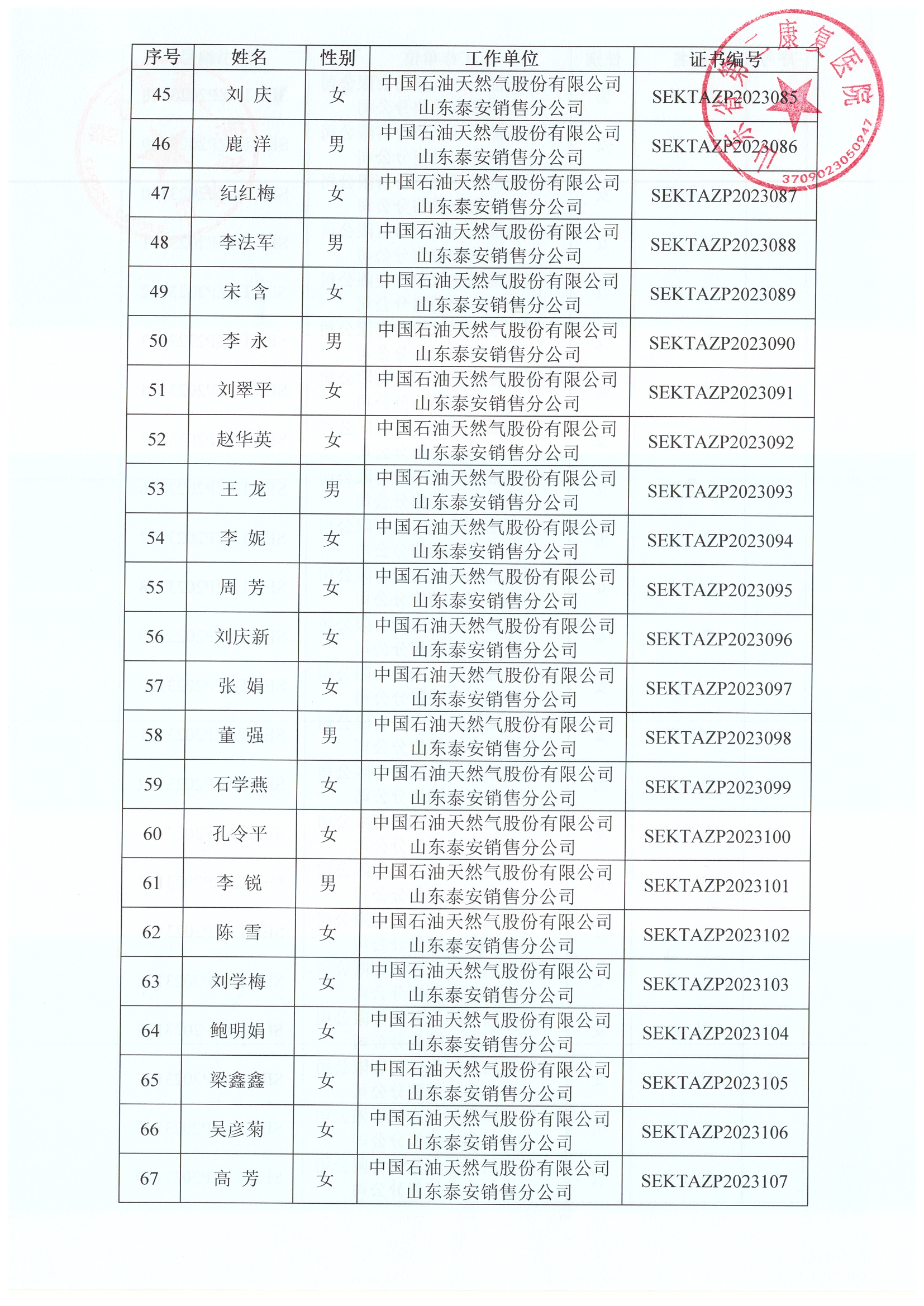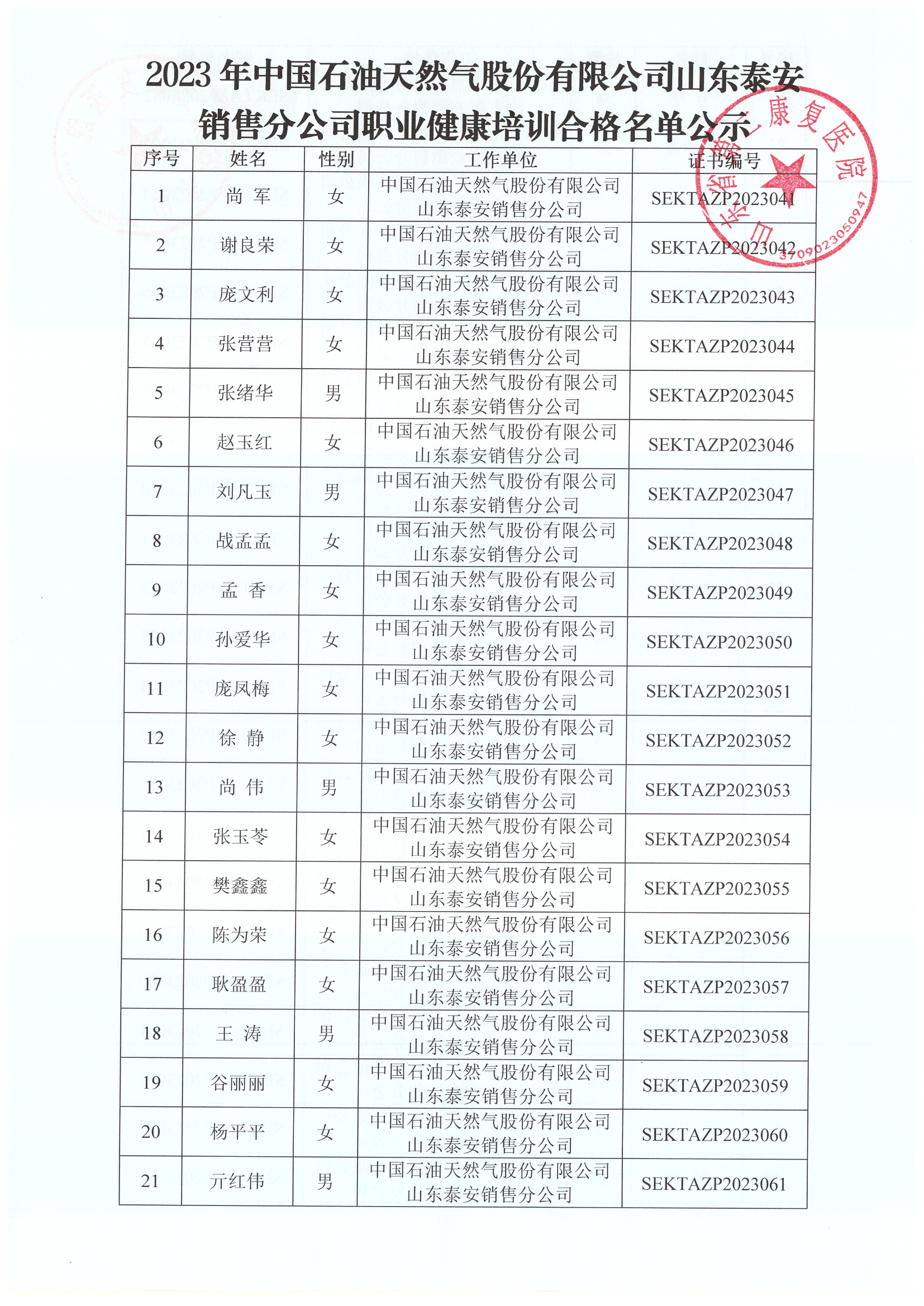 2023 年中国石油天然气股份有限公司山东泰安销售分公司职业健康培训合格名单公示